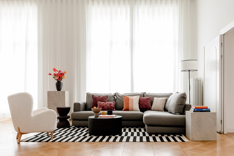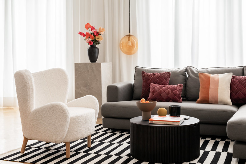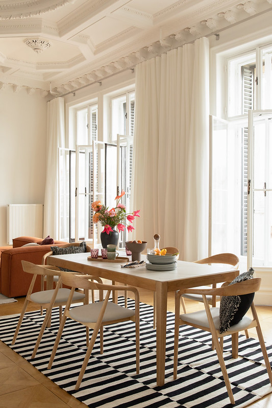 Kolekce čerpá z toho nejlepšího ze 60. let – kontrast černé a bílé, geometrické a abstraktní vzory a subtilní akcenty matného zlata. Důležitý je i výběr materiálů: tmavé dřevo, samet, světlé vlněné textilie – díky tomu vše zaujme již na první pohled.