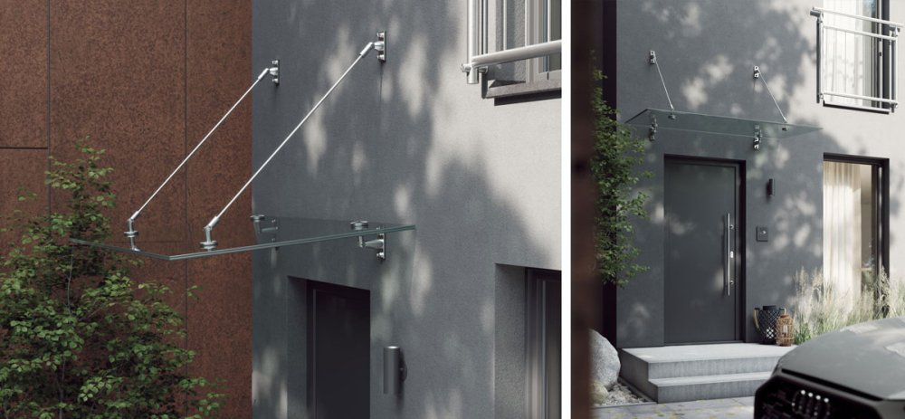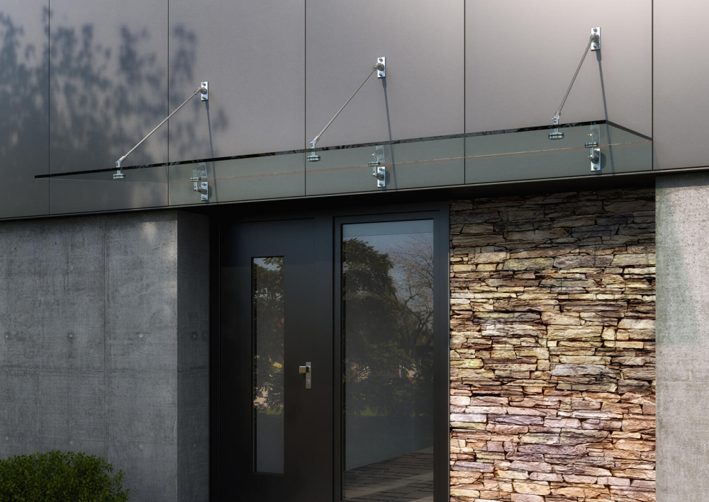 Montáž skleněné desky je k dispozici v několika variantách, vždy je však zapotřebí znát tloušťku skladby fasády z důvodu dodání správné délky prodloužení kotevního materiálu. Nejčastěji používanou možností je uchycení pomocí nerezových tyčí a kotvících nastavitelných kloubů – model stříšky RAIN, které udržují konkrétní bezpečný sklon stříšky. Celek působí odlehčeným a čistým dojmem.