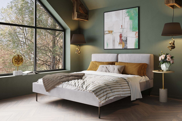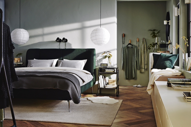 Čalouněná postel Säbövik (IKEA), 160 × 200 cm, cena včetně matrace 10 990 Kč, www.ikea.cz