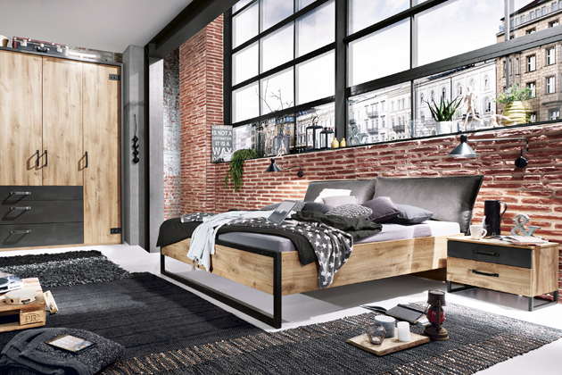 Postel Detroit, laminovaná dřevotříska dekor prkenný dub, kovové nohy, čelo v imitaci kůže, 180 × 200 cm, cena 15 499 Kč, www.asko.cz
