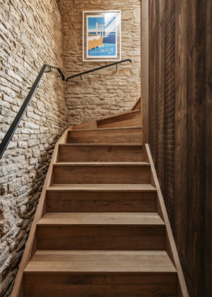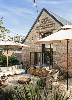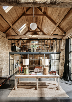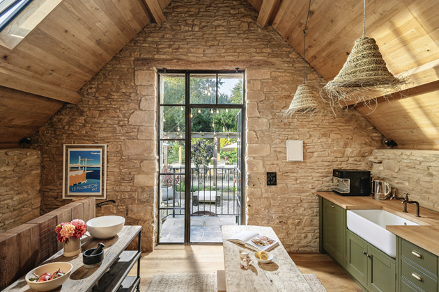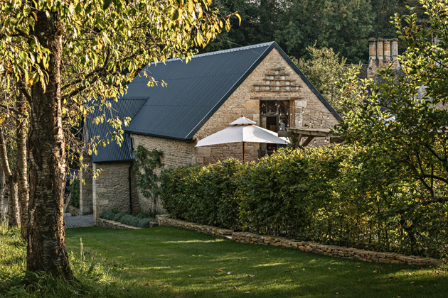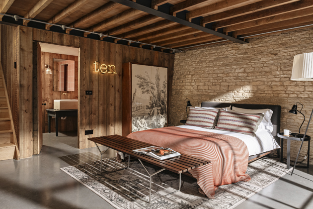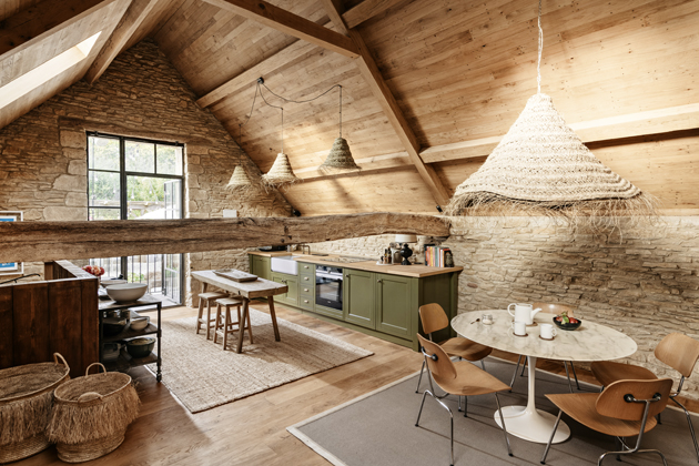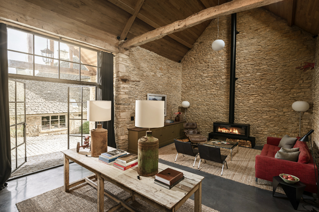 Při rekonstrukci se majitelé inspirovali okolními stodolami a pracovali s klasickými materiály typickými pro region Cotswolds, neváhali je ovšem kombinovat s uměním a ikonami užitého designu. V kamenné stodole se tak dnes můžete pohodlně usadit do jedinečného křesla Vitra Eames Lounge Chair či v klidu posnídat u legendárního kulatého stolu Knoll Saarinen.