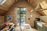 Foto: Unique HomestaysV části stavení, kde je prostor otevřený až ke střešnímu krovu, se nachází komfortní společenské posezení s prostornou červenou pohovkou a rozměrným krbem, který venkovskou atmosféru dotahuje k dokonalosti. Dostatek denního světla zajišťuje francouzské okno s ocelovým rámem, ke kterému z druhé strany přiléhá vestavěné patro. Přízemní část s ložnicí od obývacího pokoje odděluje prosklená ocelová příčka, díky které denní světlo nechybí ani v privátní části.