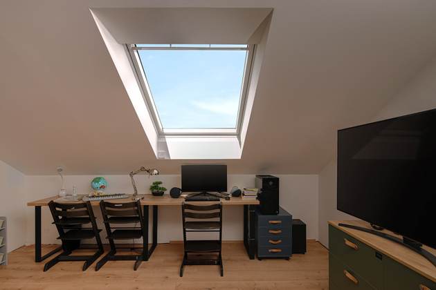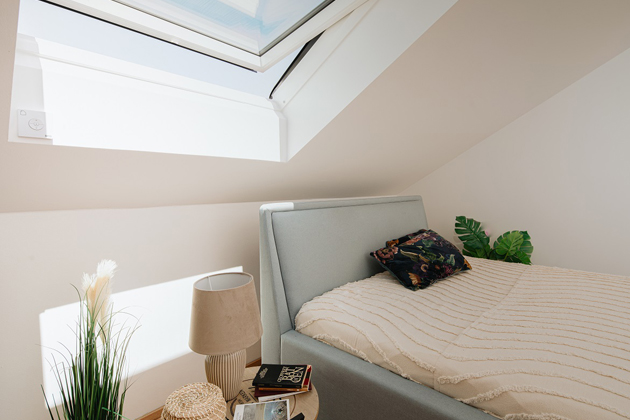 Společně s architektem navrhli Petr s Karolínou nové dispozice a rozměry oken a jejich plochu tak téměř zdvojnásobili. Díky tomu dostali do prostoru více denního světla a zvýšili možnosti, jak je využívat naplno. V neposlední řadě lze nyní místnosti i mnohem lépe vyvětrat. „S čím jsme v podkroví bojovali, bylo teplo. Máme všechny čtyři ložnice hned pod střechou, proto jsme si zvolili střešní okna s venkovními roletami,“ říká paní domu. Zatímco Karolína pamatovala na praktičnost a estetiku, Petr se na jejich výběr díval hlavně z hlediska moderních technologií, proto si vybrali střešní okna s chytrým řízením VELUX ACTIVE: „U nových oken pro mě byla zásadní motorizace. Chtěli jsme, aby se okna automaticky otevírala a zavírala, a stejné požadavky jsme měli i na stínění. Velmi zásadní je pro nás i automatické zavírání oken v případě deště. Máme tři malé děti a někdy byl problém zavřít okna včas. Člověk si nyní může nastavit různé režimy a nemusí se o okna vůbec starat.“ říká Petr a dodává, že dalším požadavkem bylo i to, aby okna měla dobrou tepelnou, ale i hlukovou izolaci, protože dům stojí v blízkosti dálnice.