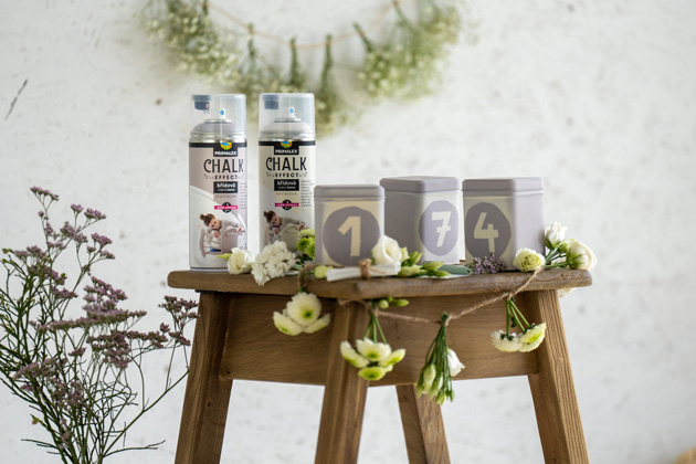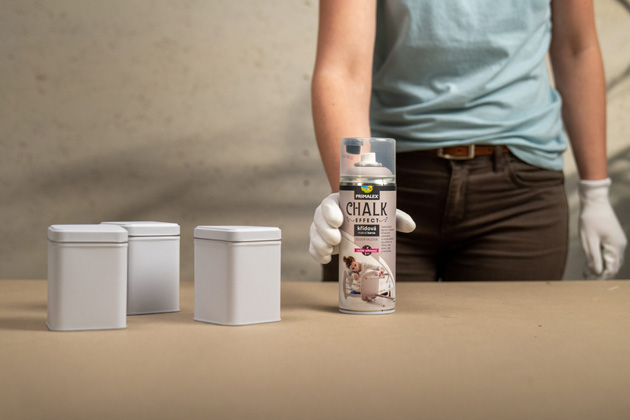 Aby schránky na vzkazy odpovídaly slavnostní příležitosti a ladily se zbylou svatební výzdobou, použijte Primalex barvy ve spreji s křídovým efektem. Dostupné jsou ve 14 jemných pastelových odstínech. Pěkně vypadá třeba kombinace krémové a šedofialové. Spreje se navíc snadno aplikují, rychle schnou a vytvářejí povrch odolný vůči mechanickému poškození i vnějším povětrnostním vlivům. Lze je použít na dřevo, sklo, kov nebo keramiku. My jsme například použili plechové dózy od čaje. Dále budete potřebovat lepicí pásku, nůžky a rukavice.
