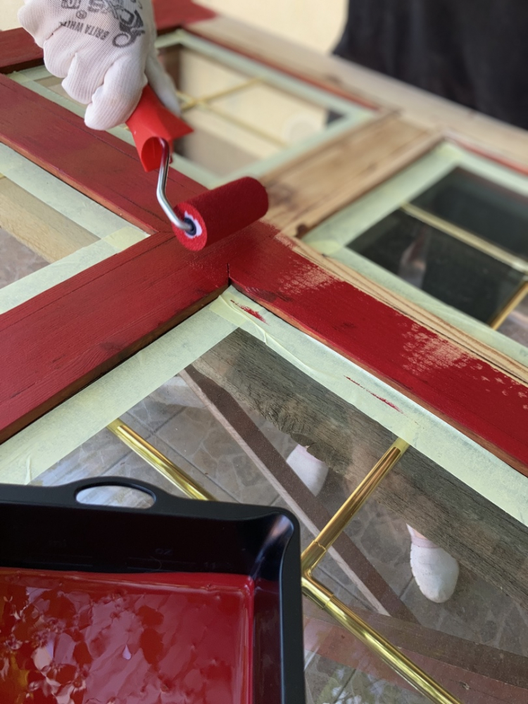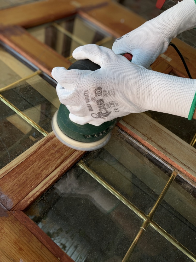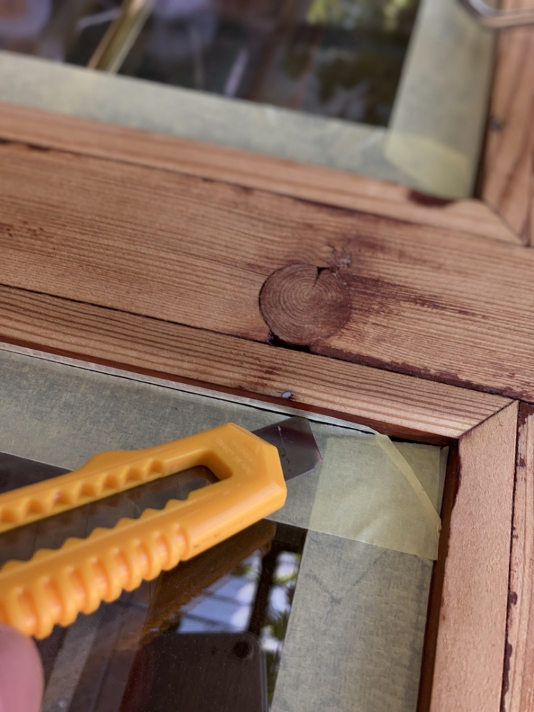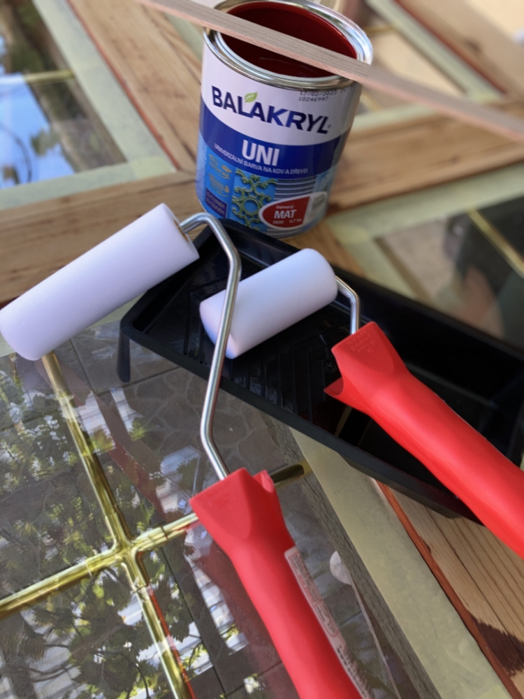 Zbroušené a očištěné dřevo je vhodné nejprve ošetřit napouštědlem proti plísním a dřevokaznému hmyzu (např. Balakryl Napouštědlo). Před natíráním jsme kraje skla oblepili lepicí páskou, aby zůstala čistá.