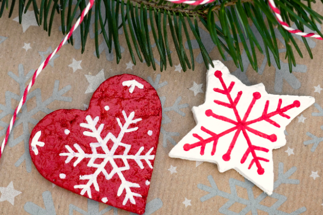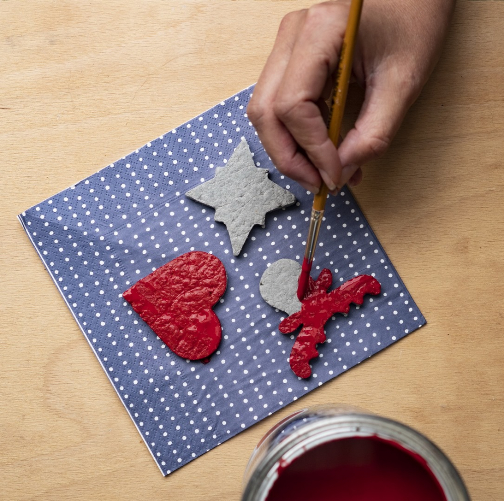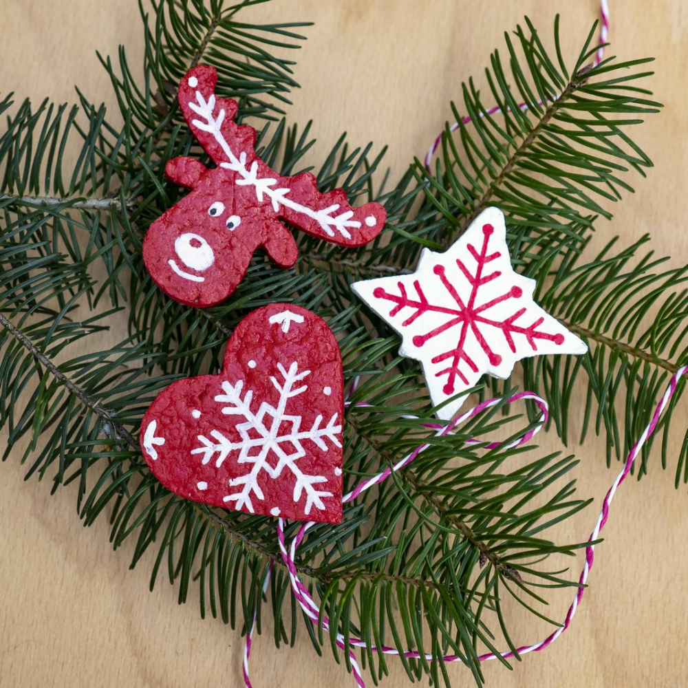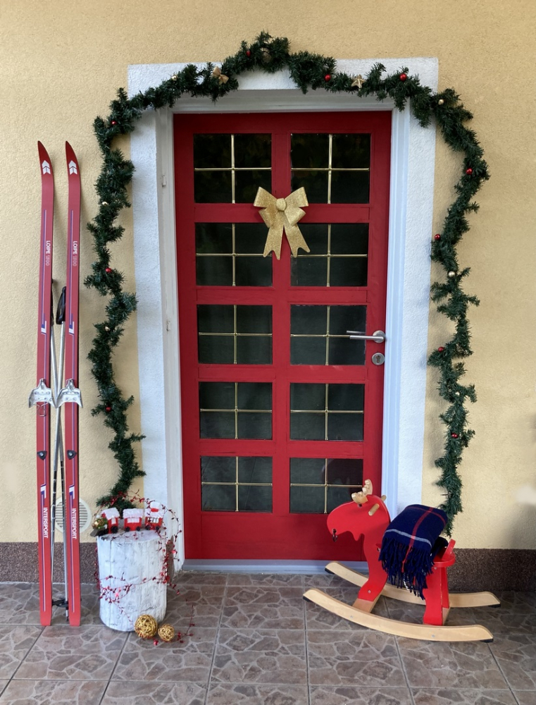 Červená barva k vánočním svátkům neodmyslitelně patří. Proto jsme vyrobili a touto tradiční barvou natřeli ozdoby z recyklovaného papíru nebo vstupní dveře.