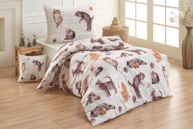 Neutrální barvy a roztomilý motiv koček na bavlněném povlečení – pro malé i velké milovníky zvířat.