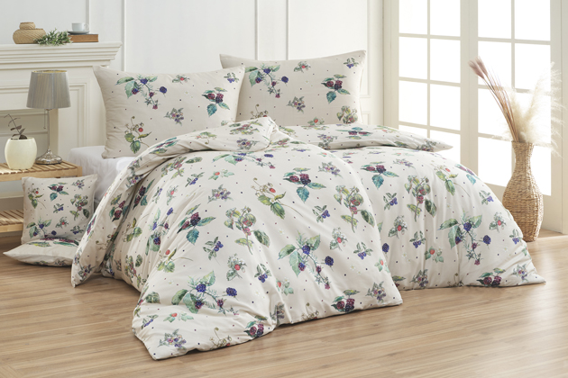 „Berinky jsou jediné s barevným podkladem. Útulnost hlubokých barev lesních plodů dotváří béžová s lehce zeleným podtónem,“ vysvětluje autorka. Jemný odlesk saténu dodává vzorům sofistikovanost a hřejivou vřelost.