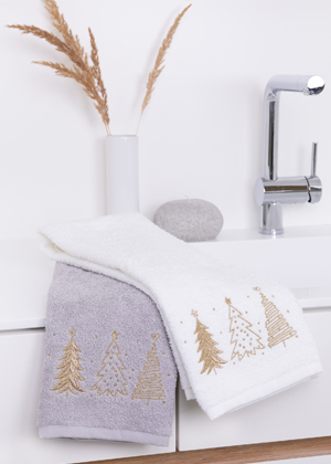 Dva hebké bavlněné ručníky (420 g/m²) s výšivkou zlatých stromků, balené v elegantní krabičce.