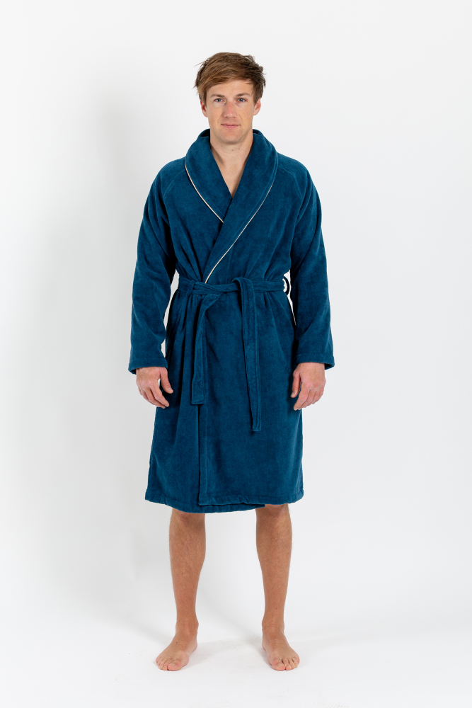 Velurové froté (380 g/m²) z 100 % bavlny zaručuje komfort po koupeli i při odpočinku. Klasický střih, zlatá paspule, praktické kapsy.