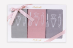 Tři vaflové utěrky (240 g/m²) z 100 % bavlny s výšivkou kuchyňského náčiní v lesklé krabičce se stuhou.