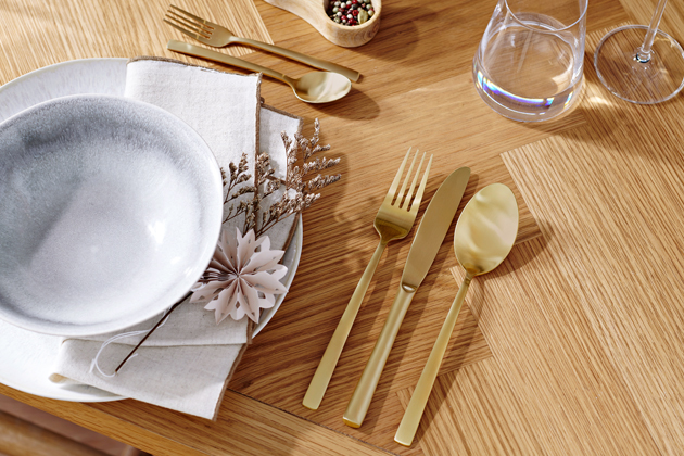 Příbory z vysoce kvalitní nerezové oceli, povrch odolný proti poškrábání v odstínu Champagne, cena 1 290 Kč / 16 ks, www.tchibo.cz
