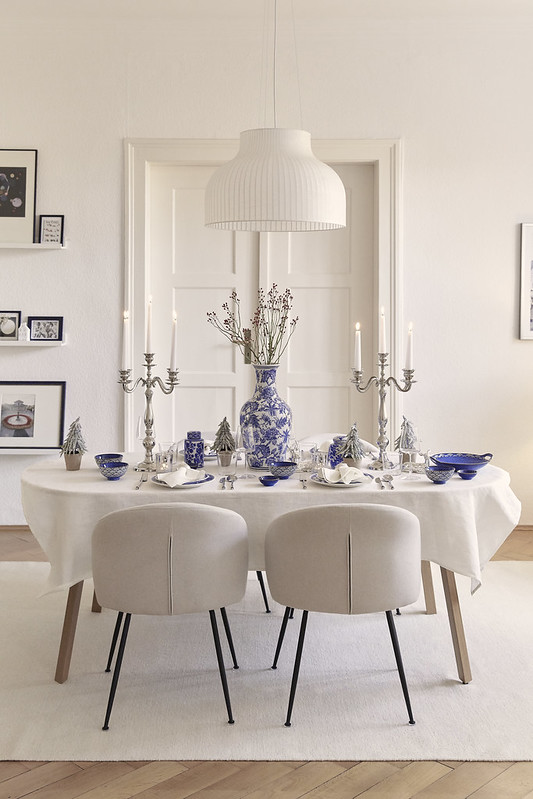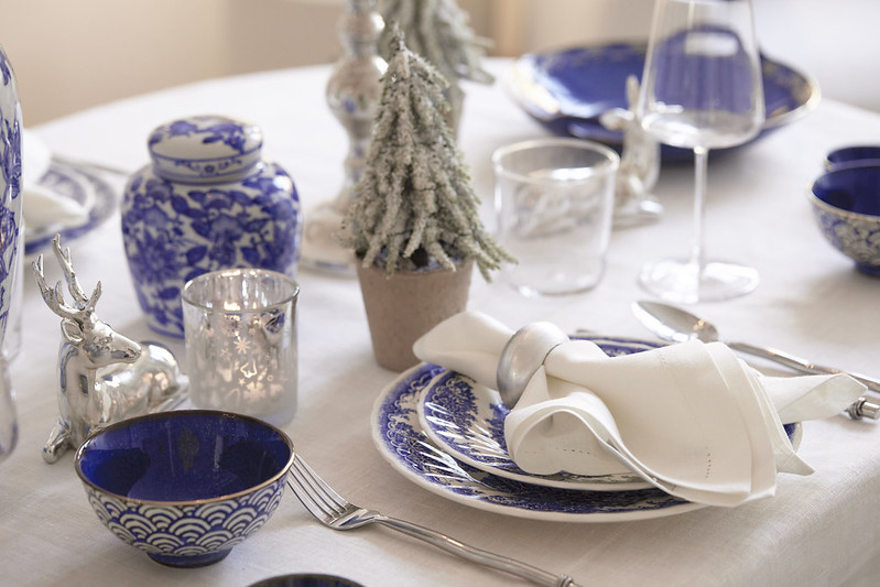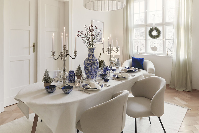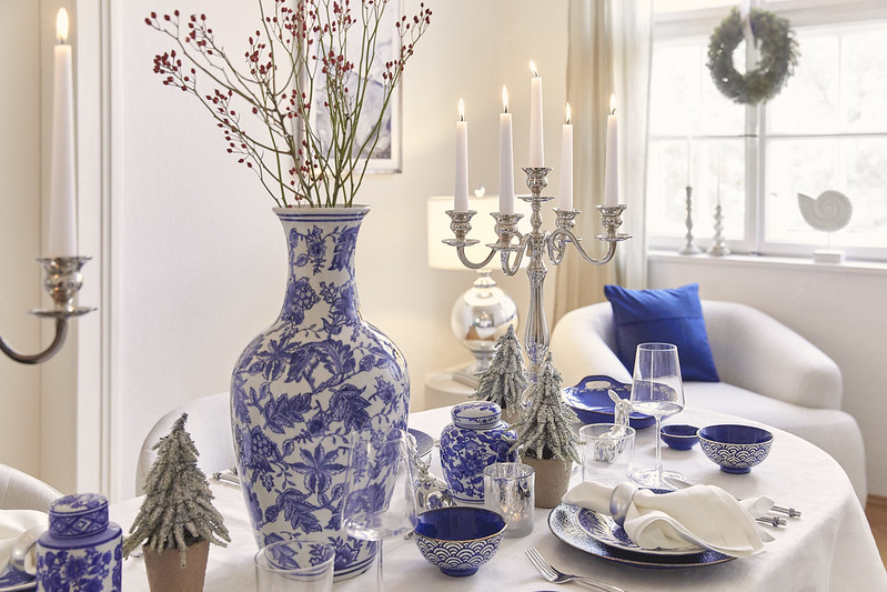 Typické barvy Hamptons se perfektně hodí ke slavnostnímu aranžmá. Modrá odkazuje na zimní auru, zatímco stříbrná prosvětluje interiér elegantní září.