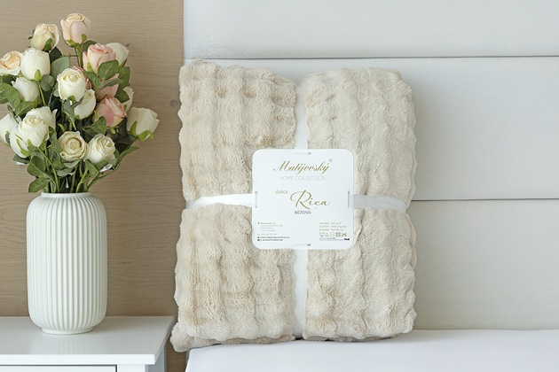Hebká plyšová deka Rica s vyšší gramáží 450 g/m2 je hřejivá, nadýchaná a hebká na dotek. Díky originálnímu vzhledu poslouží i jako elegantní doplněk interiéru. Decentní béžový odstín se snadno kombinuje s dalšími doplňky. Rozměr 140 × 200 cm, materiál 100% polyester. Cena 890 Kč, www.matejovsky-povleceni.cz