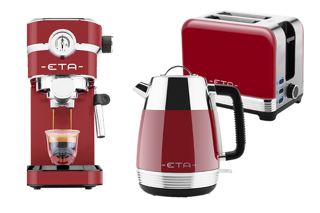 Odborníkem na snídaně se u vás může stát set značky ETA Storio ETA6181900303SET, který obsahuje kávovar s tlakem až 20 barů, rychlovarnou konvici o objemu 1,7 l a topinkovač na dvě topinky, vše v elegantní červené barvě. Kuchyňské spotřebiče si tak můžete sladit do jednoho odstínu. Cena 5 799 Kč, www.eta.cz