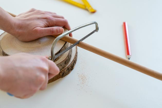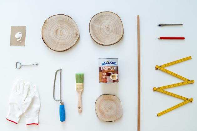 Dále si připravte kulatou dřevěnou tyč (průměr asi 1,5 cm), pilku, akuvrtačku se speciálním nástavcem zvaným sukovník, brusnou houbu, lepidlo na dřevo, štětec (vel. 1,5″) a akrylátový lak Balakryl Sportakryl, který má atest pro styk s potravinami.