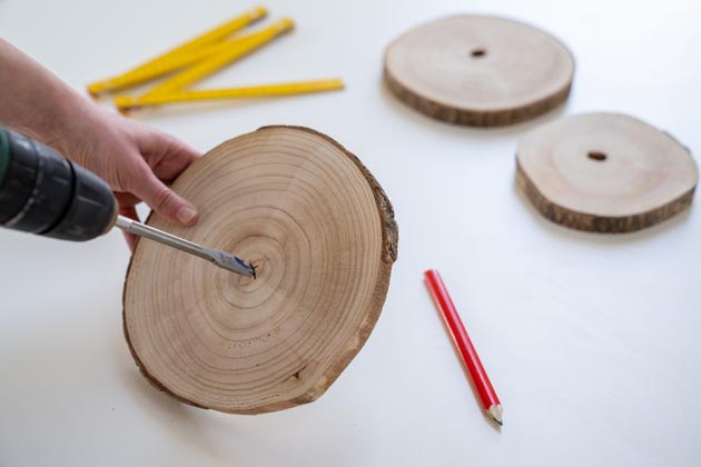 Na výrobu podnosu budete potřebovat tři různě velké dřevěné kulatiny (ideálně s viditelnými letokruhy na řezu). Široký výběr kulatin různých druhů dřeva je k dostání na internetu. Pokud použijete vlastní dřevo, nechte ho nejprve pořádně vyschnout, jinak vám kulatina popraská.