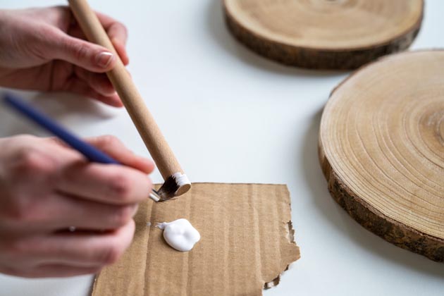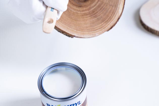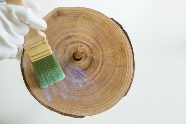 Než se pustíte do natírání, omeťte dřevo od pilin, prachu a dalších nečistot. Povrch musí být suchý, hladký a zbavený vosku a mastnoty. Lak opatrně promíchejte tak, aby v něm nevznikly vzduchové bubliny. Aplikujte ho pomocí plochého štětce z obou stran po směru dřeva. Aby se vám při natírání kulatiny lépe držely, můžete použít dřevěnou tyč, kterou provléknete vyvrtaným otvorem. Tyč na závěr nezapomeňte také natřít. První vrstvu nechte zaschnout asi 1–2 hodiny. Poté povrch jemně zdrsněte pomocí brusné houby a na všechny části etažéru naneste druhou vrstvu nátěru.