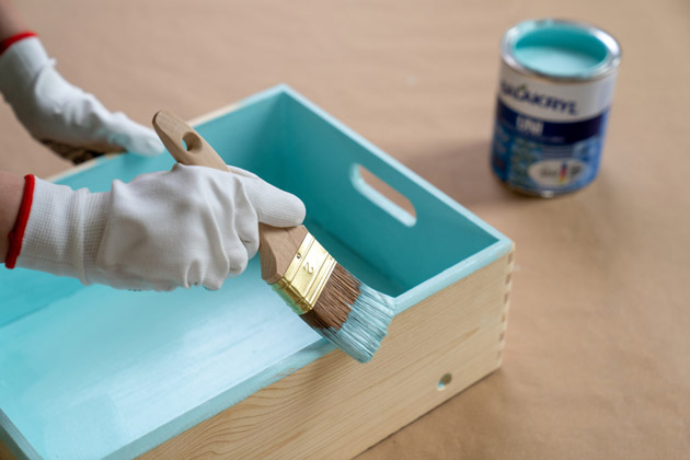 Nyní přichází na řadu natírání jednotlivých částí kočárku. Bedýnku omeťte a dle potřeby očistěte. Před aplikací nátěru musí být suchá a zbavená prachu, mastnoty a dalších nečistot. Krycí barvu Balakryl UNI důkladně promíchejte a naneste ze všech stran. Nechte zaschnout přibližně 2 hodiny. Poté povrch lehce zbruste a aplikujte druhou vrstvu.