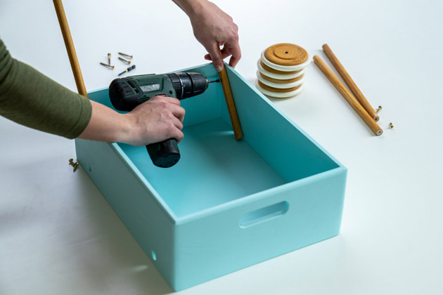 jejího dna a směrovala do přilehlého rohu. Stejným způsobem rukojeť přišroubujte i z druhé strany. Pak přimontujte kolečka. První z nich upevněte na konec spojnicové tyče. Tu pak provlékněte připravenými otvory v bedýnce a přišroubujte druhé kolečko. Postup opakujte i se dvěma zbylými kolečky.