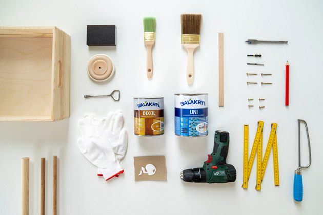 Než se pustíte do díla, připravte si menší dřevěnou bedýnku, 4 malá dřevěná pojízdná kolečka a 5 kulatých tyčí – jednu tlustší (průměr asi 3 cm) a čtyři tenčí (asi 1,5 cm). Kolečka jsou k dostání na internetu, nebo je můžete odmontovat třeba ze starého nábytku či rozbitých dětských hraček. Dále budete potřebovat lepidlo na dřevo, brusnou houbu, metr, ruční pilku, vruty a vrtačku se speciálním nástavcem zvaným sukovník (vel. 14 mm). Na natírání pak tenkovrstvou lazuru Dixol (odstín dub), univerzální krycí barvu Balakryl UNI, plochý štětec (vel. 2,5″), menší lazurovací štětec (vel. 1,5″) a pracovní rukavice.