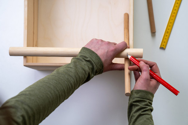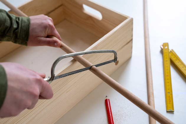Na delších stranách bedýnky si vyznačte vždy dvě místa na kolečka, a to přibližně 3 cm ode dna bedýnky. V těchto místech pomocí sukovníku vyvrtejte 4 otvory, které následně omeťte a zahlaďte pomocí brusné houby. Vyvrtanými otvory provlékněte dvě tenčí tyče, které pilkou zkraťte na šířku bedýnky a jejich hrany opět zbruste. Později na ně připevníte kolečka.