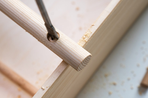 Kulatou tyč o průměru asi 3 cm nejprve pomocí pilky zkraťte, aby byla cca o 6–8 cm delší, než je šířka budoucího kočárku. Z obou stran si asi 3 cm od kraje vyznačte křížek. V těchto místech pak opět sukovníkem vyvrtejte 1 cm hluboké otvory, do kterých naneste lepidlo a vložte zbylé dvě kulaté tyče. Ty si předtím zkraťte na takovou délku, aby se kočárek dětem pohodlně vozil.