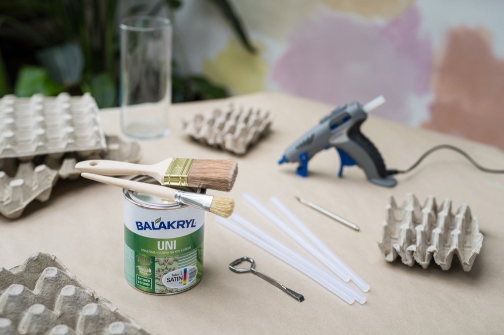 Aby se papírový karton od vajec nerozmočil, použijte jako základ jednoduchou skleněnou vázu (využít můžete i zavařovací sklenici nebo skleněnou lahev se širším hrdlem). Dále si připravte plata od vajec (na 30 ks vajec), nůžky, tavnou pistoli, vodou ředitelné barvy Balakryl UNI, otvírák na barvy, míchátko, širší a užší plochý štětec.