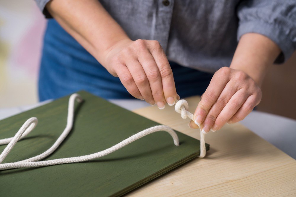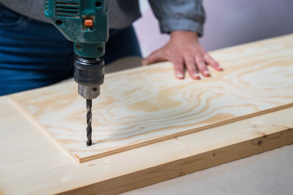 Výrobu dekorativní poličky na květiny zvládne každý i u sebe doma. Potřebovat budete dřevěnou desku, dostatečné dlouhý a pevný provaz, nůžky, vrtačku, kulatý pilník, tužku, pravítko, malý malířský váleček, štětec a univerzální vodou ředitelnou barvu Balakryl UNI (odstín RAL 6003). Připravte si desku oříznutou na požadovaný rozměr. Měla by být čistá, suchá a zbavená mastnoty. Podle potřeb ji můžete lehce (u staršího dřeva od původního nátěru naopak důkladně) zbrousit. Desku připevněte svěrkami k pracovní desce. Pomocí tužky a pravítka si v každém rohu desky vyznačte přibližně ve vzdálenosti 5 cm od kraje křížek. V těchto místech následně vyvrtejte otvory. Jejich velikost by měla odpovídat tloušťce zvoleného provazu. Všechny čtyři otvory pak pomocí kulatého pilníku zahlaďte.
