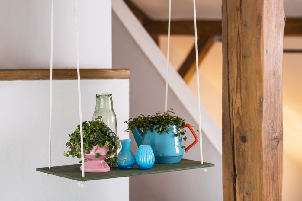 Postrádáte doma praktickou poličku na květináče, knihy nebo na odkládání suvenýrů z dovolené? Pokud nemůžete nebo nechcete vrtat do zdi, inspirujte se naší závěsnou poličkou, kterou lze jednoduše přivázat na trám či zábradlí nebo na zahradní pergolu, kde ji využijete na bylinky nebo truhlíky. Pomocí kovových vrutů s okem poličku také můžete zavěsit přímo na strop.