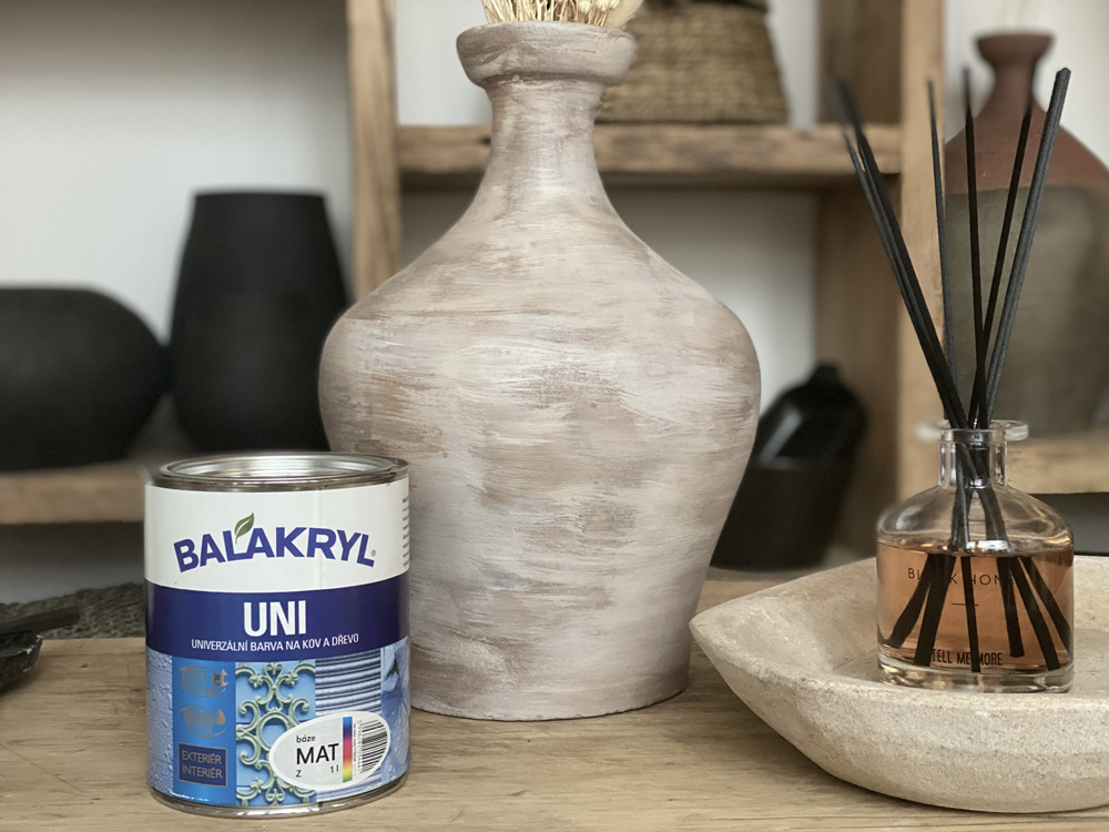 Vodou ředitelné ekologické barvy Balakryl UNI jsou vhodné pro patinování nábytku i dekorací z různých materiálů – kovu, dřeva, plastu betonu i keramiky. Navíc rychle schnou, nezapáchají a snadno se aplikují. Patinování můžete provádět několika různými způsoby. Ve spolupráci s blogerkou a designérkou Zuzanou Kaščákovou vám poradíme, jak natřít keramickou vázu technikou patinování suchým štětcem. Potřebovat k tomu budete plochý štětec, hadřík a krycí barvy Balakryl UNI v béžovém (S 1002-Y50R) a šedohnědém (S 5010-Y50R) odstínu.