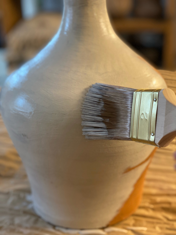 Vázu nejprve očistěte od prachu a všech nečistot. Pak barvu důkladně rozmíchejte. Štětec namáčejte do béžové barvy, ale jen zlehka. Poté ho vždy dobře osušte do připraveného hadříku. Nátěr nanášejte na vázu dlouhými tahy vedenými vždy ve stejném směru kolem dokola. Jakmile první vrstva nátěru dobře zaschne, aplikujte stejným způsobem šedohnědý odstín.