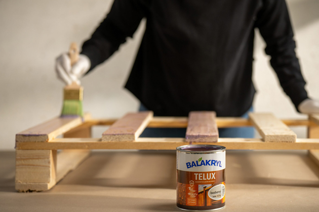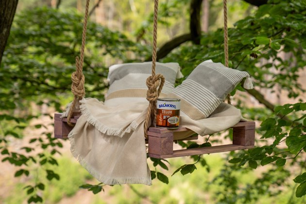 Na výrobu houpačky si připravte menší dřevěnou paletu (pro jednoho stačí rozměry kolem 80 x 60 cm) a silnovrstvou lazuru na dřevo Balakryl Telux. Dále budete potřebovat lazurovací štětec (vel. 2″), pevné jutové lano, brusnou houbu, pracovní rukavice, otvírák na barvu a nůž na zkrácení provazu.