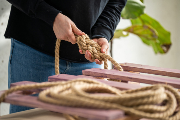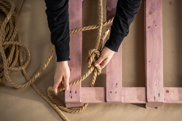 Až budete s výsledným odstínem spokojeni, nechte lazuru zaschnout. Dále si připravte čtyři stejně dlouhé kusy pevného jutového lana (průměr 1,2 mm) a přivažte jimi každý roh palety. Uchycení musí být dostatečně pevné a bezpečné. Doporučujeme použít například lodní smyčku nebo tzv. osmičkový uzel, který používají horolezci.