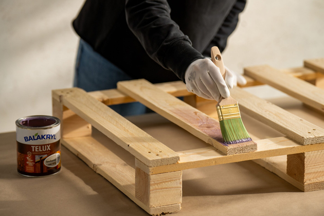 Palety bývají vyrobené z čistého, ničím neošetřeného dřeva, a proto je důležité povrch řádně připravit. Nejprve ho ze všech stran důkladně zbruste (použijte hrubší houbu) a poté omeťte od pilin, prachu a dalších nečistot. Před natíráním musí být podklad také suchý a zbavený mastnoty, pryskyřice a zbytků vosku.