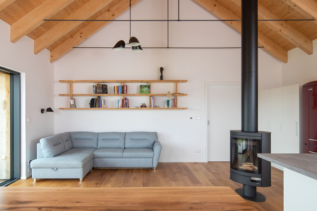 Vstup do domu vede nejprve do prostorné chodby a z ní ihned do hlavního obytného prostoru, kde zaujme jeho minimalistický a čistý design. Stěny místnosti jsou čistě bílé, což umožňuje vyniknout nábytku a dekoracím. Centrálním prvkem místnosti jsou menší černá krbová kamna oválného tvaru. Komín těchto kamen prochází vysokým stropem, který zůstal otevřený až do špice samotné střechy, s přiznanými dřevěnými trámy. „Šikmý strop ve tvaru písmene A působí vzdušně a zároveň příjemně a místnosti dodává světlý charakter,“ doplňuje autor projektu. Ze stropu visí dvě závěsná černá světla se třemi lampami na konci, která tvoří hlavní osvětlení místnosti. Na pravé straně od dveří se nachází odpočinková zóna s velkou modrou rohovou pohovkou, nad kterou je umístěna police sloužící zároveň jako knihovna. Na stěně je také malá černá čtecí lampička ladící se stropními svítidly.