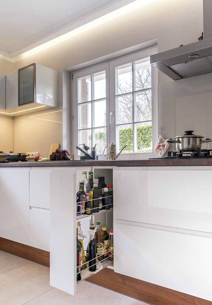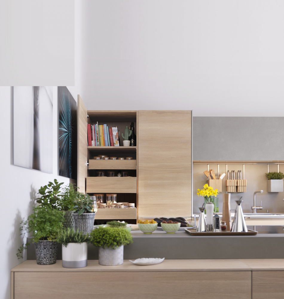 K dispozici jsou i systémy, které se po vysunutí ze skříně ještě otočí. K úložným účelům se nyní více využívá například i stěna nad pracovní deskou, která se dá osadit úzkými policemi nebo závěsnými prvky.