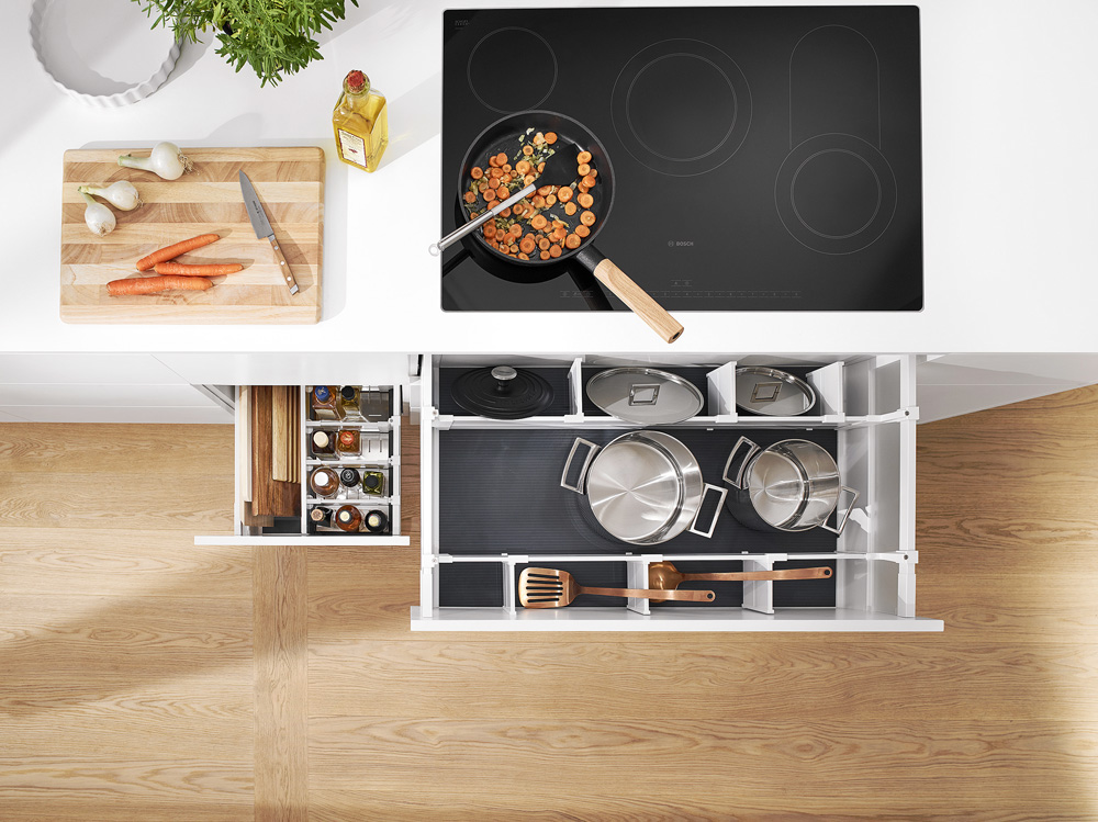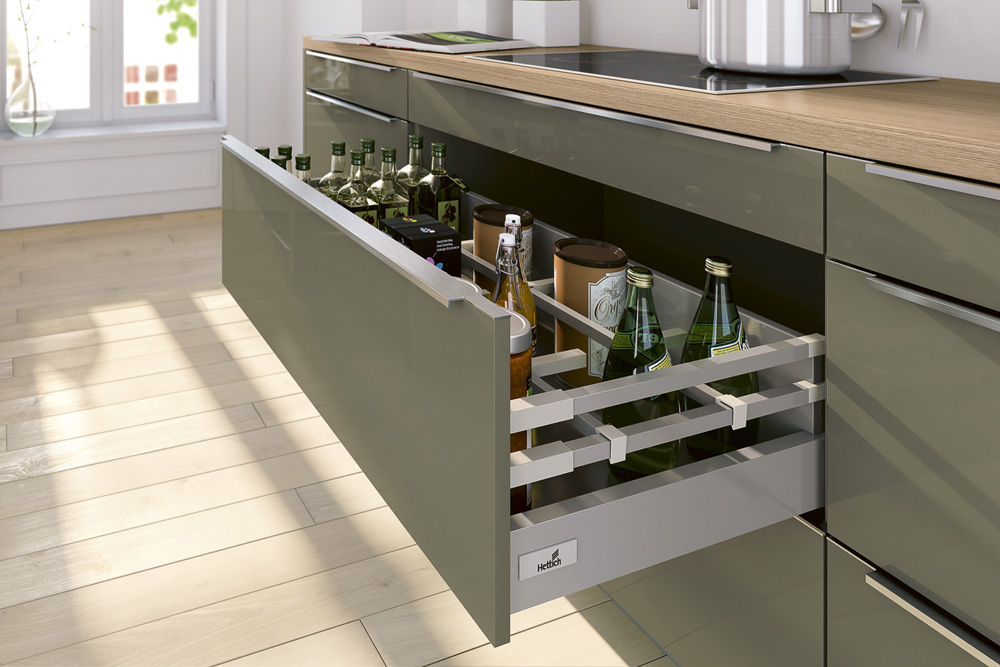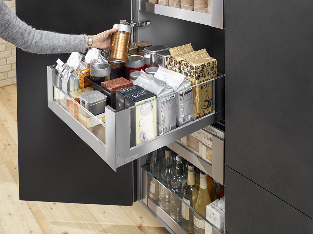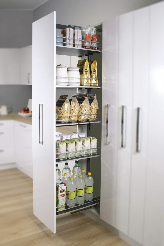 Předpokladem funkční kuchyně je promyšlený systém ukládání potravinových zásob. Přehlednosti pomáhají různé výsuvné systémy, které usnadní ukládání i do těžko dostupných částí kuchyňského nábytku. Praktickým doplňkem vysokých potravinových skříní jsou plnovýsuvné zásuvky s průhlednými bočnicemi nebo drátěné konstrukce s policemi, které jsou po vysunutí přístupné z více stran.
