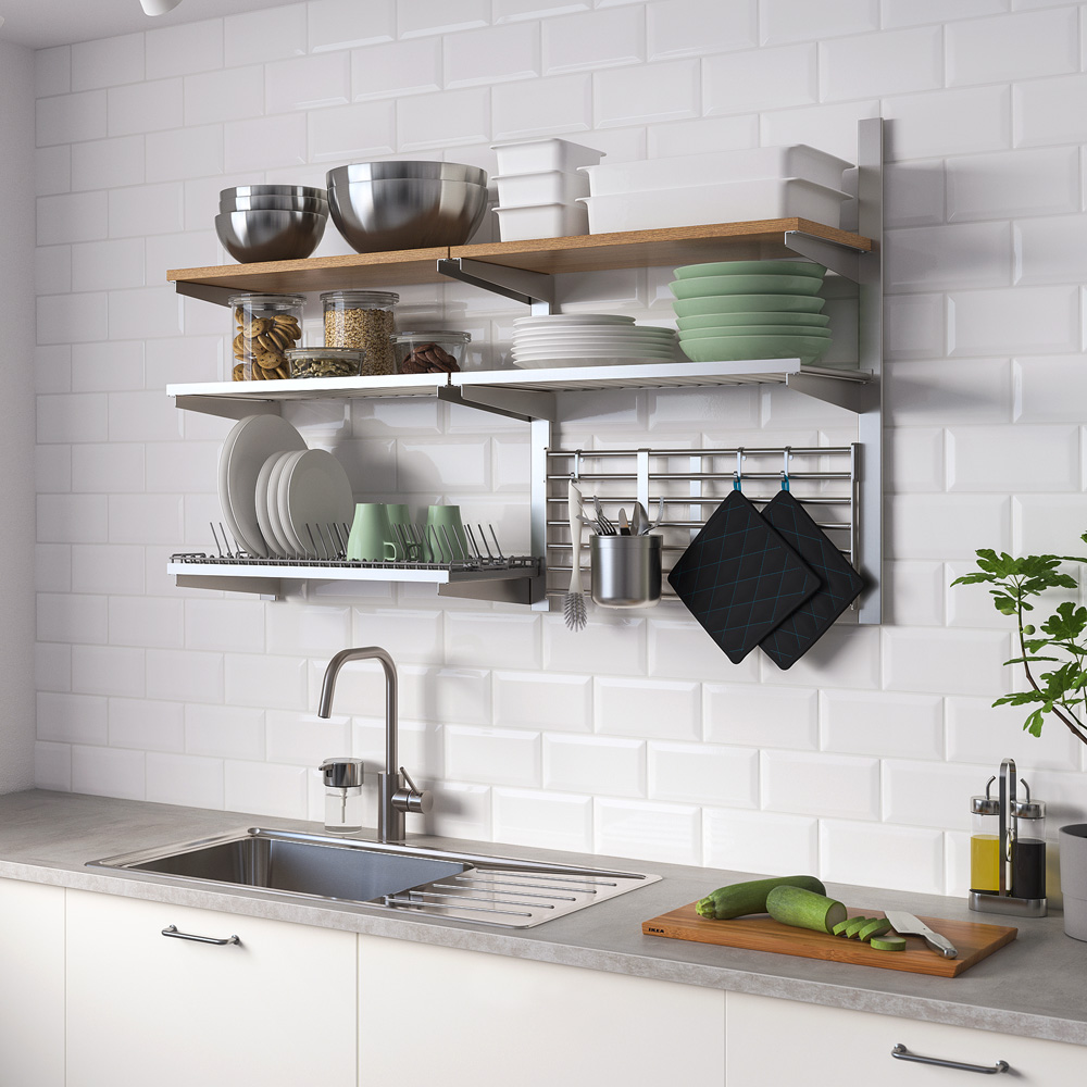 Do rohových skříněk se používají rozmanité otočné nebo výsuvné konstrukce s policemi, které umožní ukládání nádobí i do těžko dostupných koutů. Oblíbené jsou také úzké výsuvné drátěné police se zarážkami, které jsou vhodné na ukládání nádob s dochucovadly. Tyto atypické prvky navíc umožní přizpůsobit šířku nábytku individuálním potřebám.