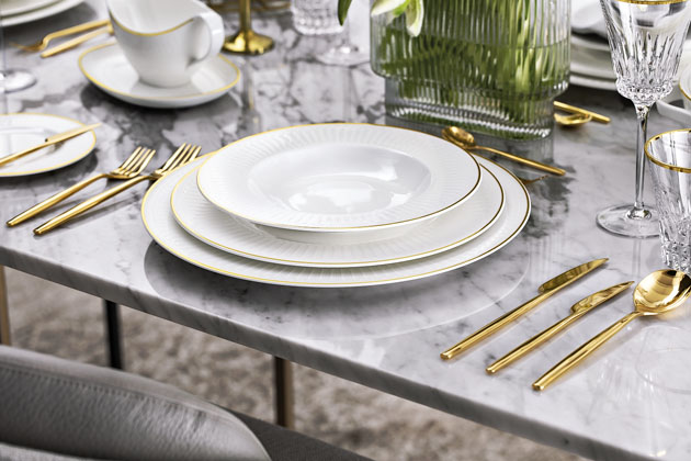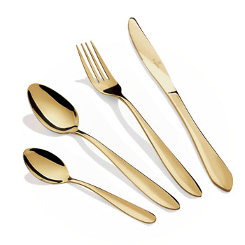 Příbor z luxusní sady MetroChic d’Ore (Villeroy & Boch), 30 ks, pozlacená nerezová ocel, cena 29 050 Kč, www.pottenpannen.cz