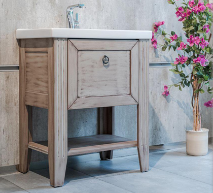 Za pozornost stojí rovněž možnost zvolit u koupelnových dvířek speciální patinovanou povrchovou úpravu, která vzniká pomocí ručního jemného proškrabávání vrchní lakované vrstvy. „Tradičním designem jsme se inspirovali například u kolekce Antik,“ říká Ing. Petr Blažek a pokračuje: „Frézovaná čela, stylové nožičky a otevřené police evokují atmosféru venkovských interiérů i dobových prostor, což kolekci předurčuje k využití v celé řadě stylově laděných koupelen.“ Skříňky lze doplnit o originální kovové úchytky, nebo zvolit variantu bez úchytky a přizpůsobit si jejich finální podobu vlastním představám.