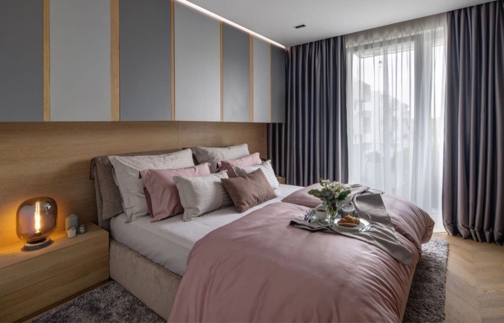 V každém interiéru se snažím, aby tam fungovaly určité propojovací elementy, a to v celém bytě. Může to být i něco, co se opakuje na strukturách, obkladech, textiliích… A tak to bylo i v tomto případě. Tím, že jsem použila lehce bělený dub s šedivými elementy koberce a závěsu, tak jsem hledala něco, co by šlo tón v tónu. Zároveň jsem chtěla zakomponovat i roční období nebo barvu, kterou mám všude v bytě. Mám tu dva prolínající se odstíny, tyrkysovou a starorůžovou, takže nebylo moc nad čím přemýšlet. Starorůžové Never Too Late oživí lehký proužek Old Memories a celé to společně hezky funguje. A bílá, to je nadčasová klasika, která se hodí ke všemu.