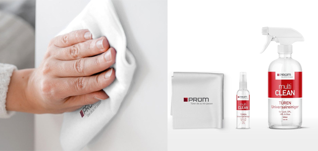 Čištění běžných nečistot na dveřích lze lehce provést pomocí univerzálního čističe multiCLEAN přímo na dveře nebo na čistící hadřík PRÜM. Po následném přetření se vaše dveře budou krásně lesknout.