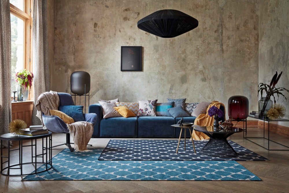Obývací pokoj jako ostrůvek klidu a pohody vykouzlíte pomocí tmavě modrého ladění. Aby interiér nepůsobil chladně, doporučujeme namísto bílé barvy použít do tandemu s tmavě modrou pískovou. Je to také univerzální barva, ale je zajímavější a teplejší než klasická bílá. Buď ji můžete použít pouze na doplňcích, nebo tímto odstínem třeba vymalovat.