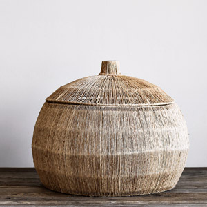 Foto: www.allegro.czKovový koš s víkem s jutovým výpletem a ratanovým dnem, 55 × 42 cm, cena 3 690 Kč, www.iconioo.cz