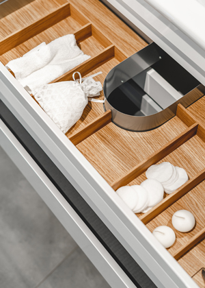 Jedněmi z hlavních koupelnových nezbytností jsou praktické organizéry, které dají všem koupelnovým nezbytnostem řád i ve velkých zásuvkách. „Pořadače jsou uzpůsobeny tak, aby do zásuvek přesně pasovaly, rozdělily prostor na více menších segmentů a počítají samozřejmě i s výřezem na sifon. Využijí tak opravdu každý centimetr. Zásuvky je také možné opatřit speciální protiskluzovou podložkou s vroubkovaným povrchem, která zajistí, že jsou všechny předměty stále na svém místě, a to i v těch nejrozměrnějších zásuvkách,“ informuje Ing. Petr Blažek z Dřevojasu. Oblíbené jsou ale zásobníky na papírové kapesníky či různé krabičky na drobnosti vhodné jak do zásuvky či do galerky.