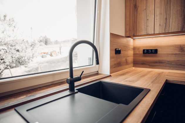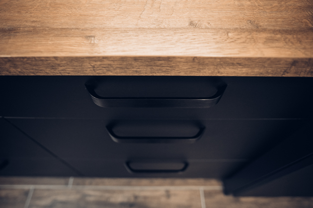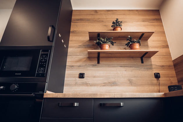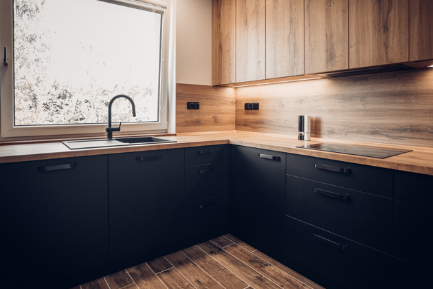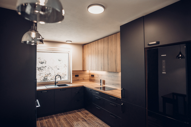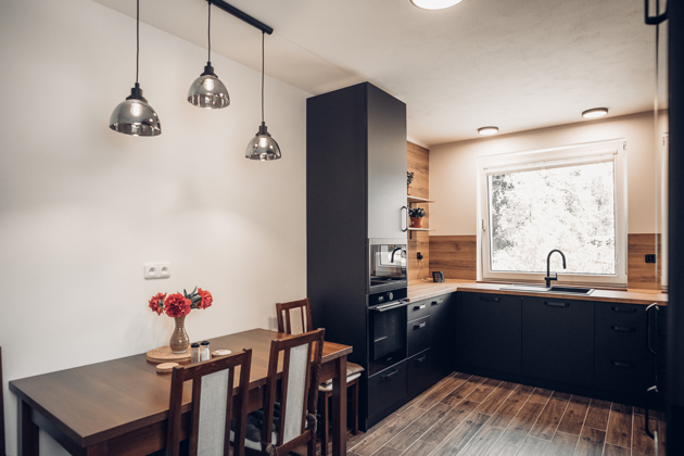 Především černá barva je skutečně stěžejním elementem místnosti. Vyskytuje se jak na kuchyňské sestavě a elektrospotřebičích, tak na dalším vybavení, jako je dřez či vodovodní baterie značky Franke. Výrazný odstín je proto odlehčen pracovní deskou v dekoru dub Sherman koňakově hnědý a nástěnným obkladem ve stejném provedení. Jejich jemná povrchová struktura v imitaci dřeva úspěšně doplňuje a zároveň rozbíjí jednolitý efekt kuchyňských skříněk, v kombinaci s vhodně umístěným oknem navíc zabraňuje vzniku tísnivé atmosféry. Vybavení potom doplňuje podlaha, která je stejně jako jídelní stůl laděna v odstínu tmavého dřeva. Díky tomu dobře koresponduje s nadčasovým zbarvením dvířek i vrchním dřevodekorem a dodává tak místu kýžený dojem ucelenosti.
