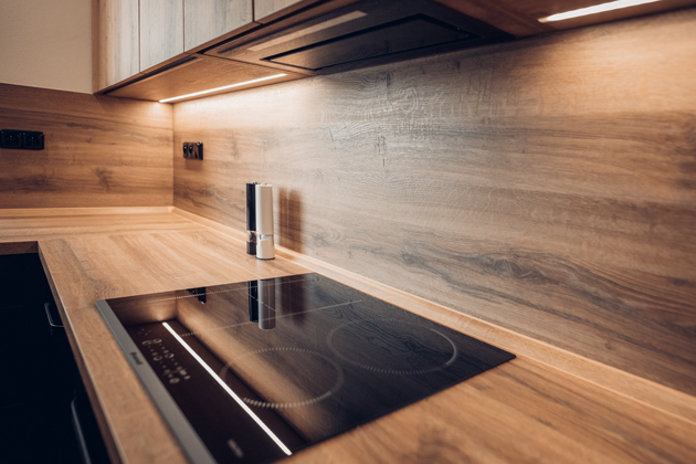 Stejně jako pracovní deska a obklad stěn, také horní skříňky vyvedené ve shodném dřevodekoru vnášejí do atmosféry místnosti vítané osvěžení. Jejich 118 centimetrů vysoká konstrukce a úzký podélný tvar zajišťují perfektní vyplnění prostoru mezi středovou stěnou a krajními skříněmi. Dvířka skříněk jsou pak na spodní straně vybavena schovanými zafrézovanými úchytkami. Absence vystouplých prvků zde napomáhá vizuálnímu odlehčení plochy, dodává jí minimalistickou ladnost designových interiérů. „Když při návrhu kuchyně používáme klasický systém otevírání horních skříněk do boku a řešíme úchytky, snažíme se dvířka neosazovat venkovními úchytkami, ale použít vnitřní zafrézovaný profil, takže se skříňky otevírají zespodu,“ popisuje Markéta Havlíková a pokračuje: „Mám tento typ horních skříněk velmi ráda. Považuji ho za určitou klasiku, která je vyladěna do moderního stylu“. Prostor pod skříňkami je vybaven praktickým LED osvětlením, jež zajišťuje nezbytné nasvícení pracovní desky. Při pohledu zpředu navíc vytváří zajímavý efekt záře vycházející „odnikud“ a umocňuje optické oddělení spodních a horních závěsných skříněk.