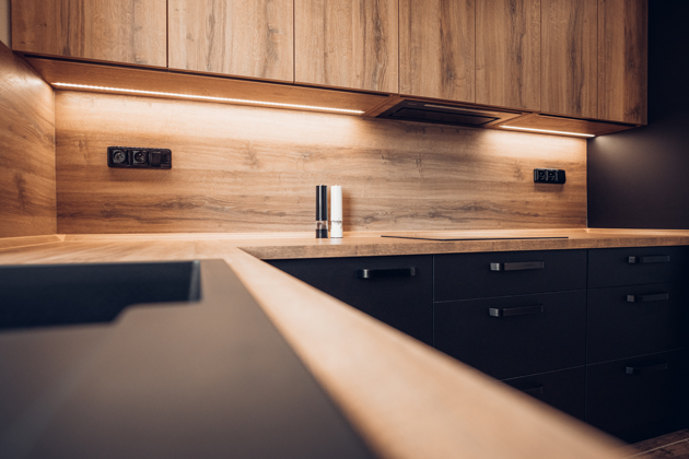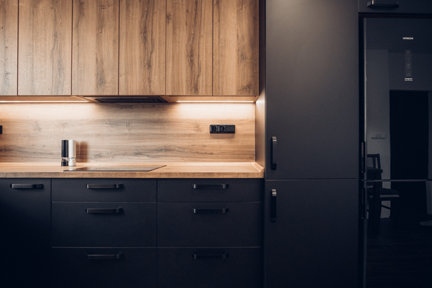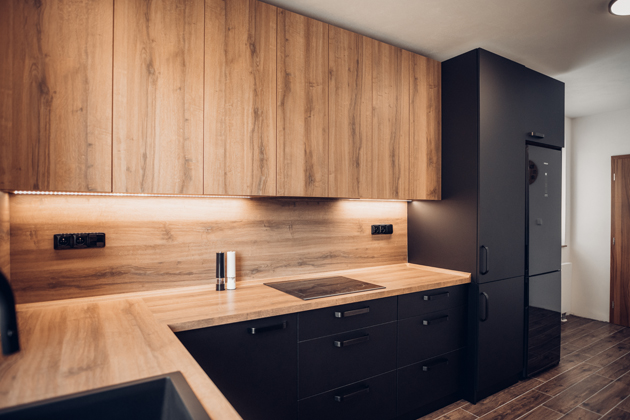 Při rekonstrukci kuchyně majitelé zvolili odvážnou kombinaci černé a dřevodekoru. Díky použití důmyslného materiálu s příměsí pravého stříbra získali nejen designově vytříbenou, ale také hygienickou, téměř bezúdržbovou a dokonale matnou kuchyň v moderním tmavém hávu.