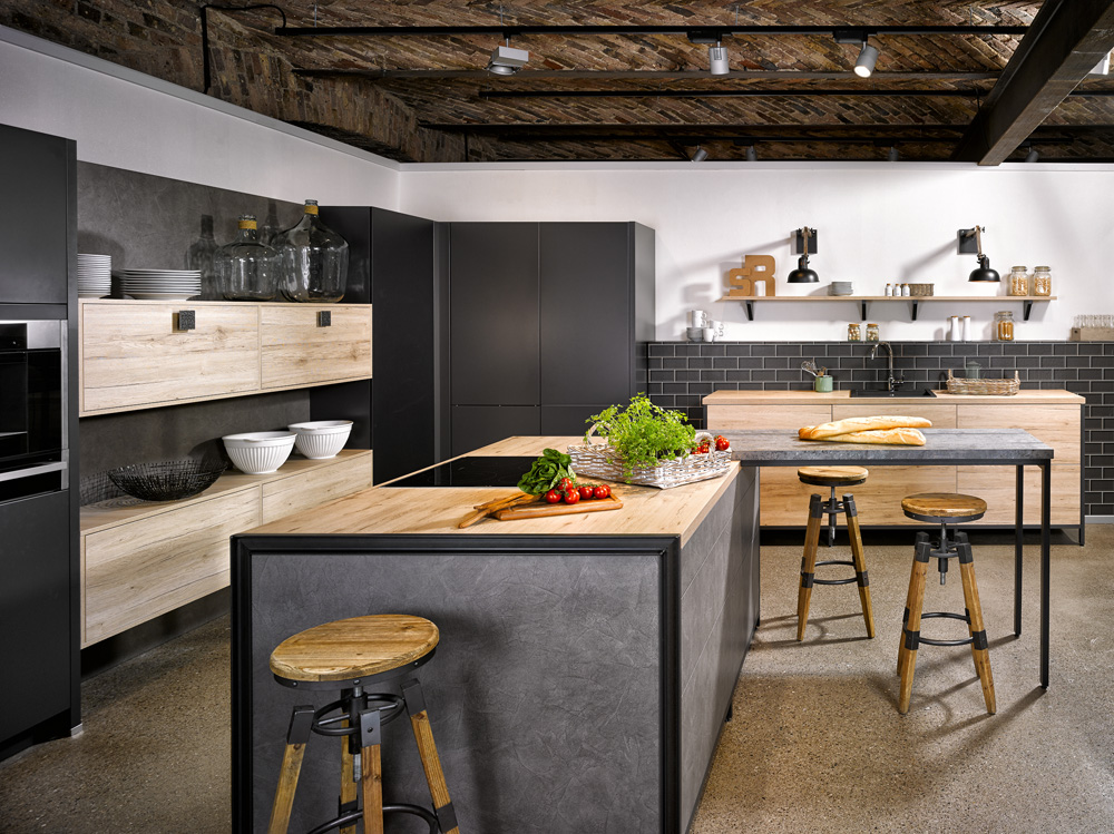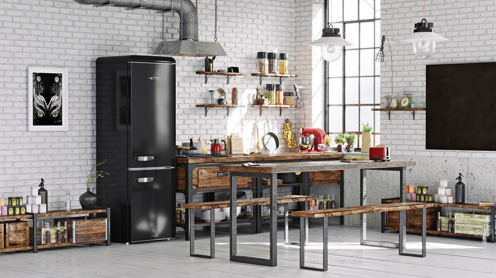 Kuchyňské sestavy s retro prvky připomínající staré tovární haly působí velmi zajímavě. Důležitou roli hrají doplňky, které mohou mít i zdobnější podobu označovanou jako industriální vintage. K typickým doplňkům z tmavého kovu se dobře hodí hrubě opracované dřevo, cihly a beton.